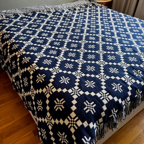 Handgjort, lyxig kudde i nyskick från Marias idé i blått och vitt. Framsidan har ett mönster med stjärnor och bårder, medan baksidan har ett randigt mönster. Kudden har tofsar i hörnen. Tillverkad av 100% ren ull. Medföljande innerkudde. Mått 50x60 cm. OBS! Ej använd. Vikt 1100 gram.