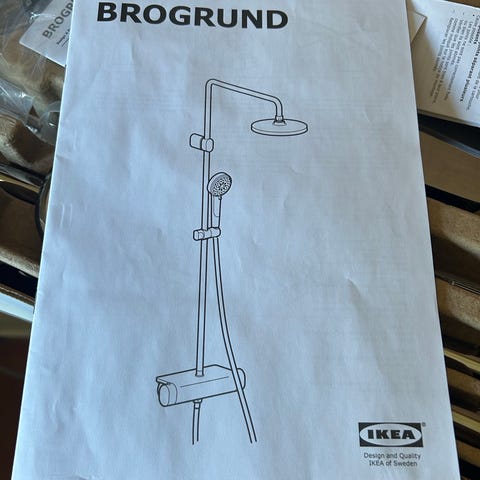 Ikea Brogrund duschset i kromfärg. Setet innehåller duschstång med handdusch och takdusch enligt förpackningens illustration. Avsett för montering i duschutrymme eller badrum. Levereras i originalkartong.