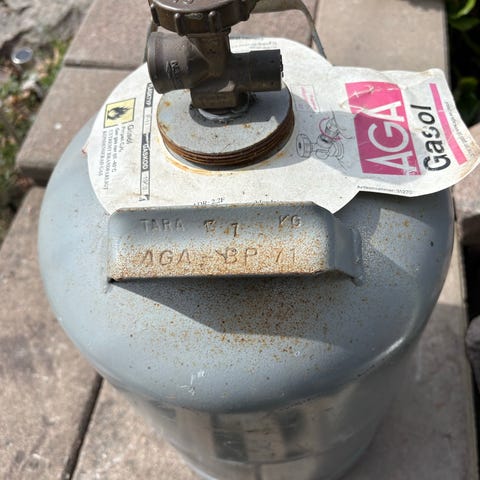 AGA gasolflaska i stål. Flaskan är avsedd för förvaring av gasol och har ventil upptill för anslutning mot regulator eller utrustning. Passar exempelvis till gasolgrill, värmare eller annan gasolutrustning som använder denna typ av flaska. Kontrollera gällande säkerhetsföreskrifter och fyllningsrutiner vid användning och transport.