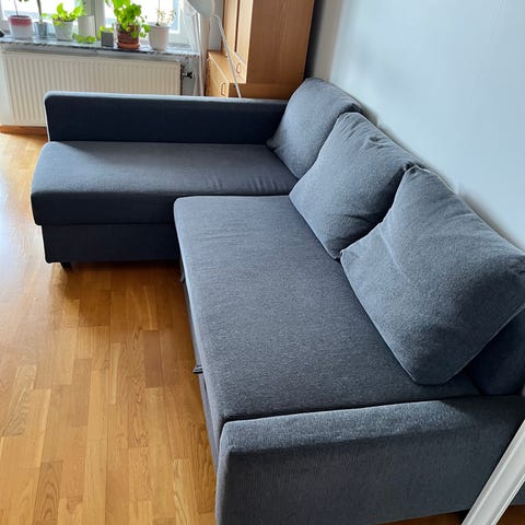 Säljer en snygg och bekväm hörnsoffa med bäddfunktion. Soffan är klädd i mörkt tyg och har en modern, tidlös design som passar i de flesta hem.