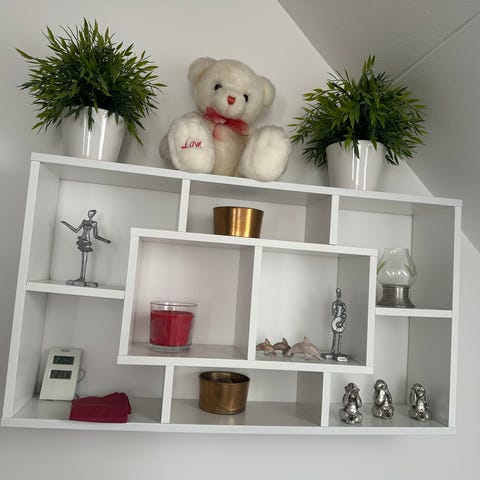 Säljer en stilren och modern vit designhylla. Hyllan består av flera kubformade fack i en lekfull och asymmetrisk form, vilket gör den till en riktig blickfångare i hemmet – perfekt för böcker, växter eller prydnader.