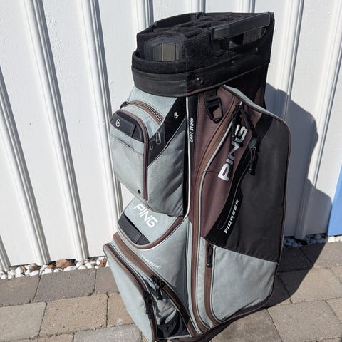 Cobra golfbag i svart och grå färg. Flera ytterfack med dragkedja för förvaring av golfbollar, tillbehör och personliga saker. Bärrem på sidan samt handtag för enkel hantering. Passar för förvaring och transport av golfklubbor på bana och range. Plus äldre vagn men fungerar perfekt.