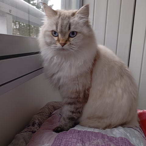 Zion (den vita) är en ragcoon 75% ragdoll och 25% main coon. Social och är med överallt. Blir 1 år nu i maj.