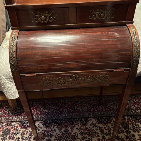 Sekretär i trä i vit kulör med dekorativa guldfärgade ornament på klaffen. Möbeln står på svarvade ben med tvärslå och har en nedfällbar skrivklaff. Invändigt finns utrymme för förvaring av papper, böcker eller mindre föremål. Ytan visar spår av slitage och patina. Passar som skrivplats eller förvaringsmöbel i exempelvis vardagsrum, sovrum eller hall.