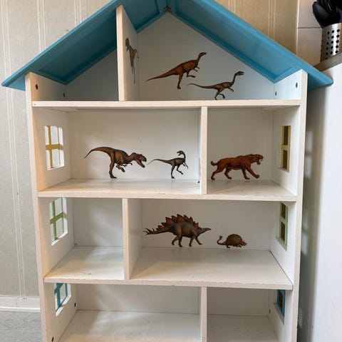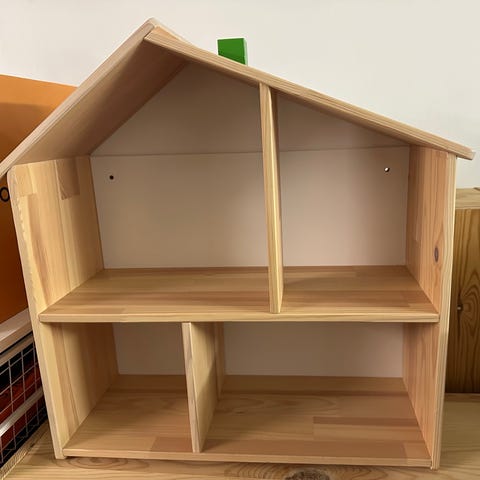 IKEA dockskåp hylla i trä med husformad design. Hyllan har flera öppna fack i olika storlekar som kan användas för dockor, leksaker eller förvaring i barnrum. Tillverkad i trä med naturfärgad yta. Mått enligt skiss: cirka 59 cm hög, 52 cm bred och 22 cm djup, med olika fackhöjder och -bredder för varierad förvaring.