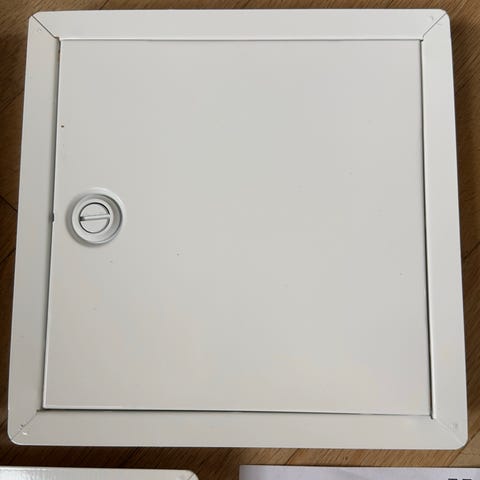 Säljer en vit inspektionslucka i plast, ca 300x300 mm. Luckan används för att ge enkel åtkomst till dolda installationer bakom vägg eller tak, till exempel vattenrör, ventilationsspjäll, elledningar eller andra tekniska installationer.