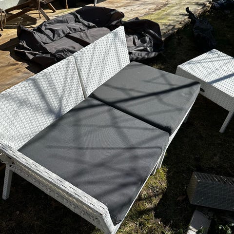 Uteplatsmöbel set med en mindre soffa, två fåtöljer och ett rektangulärt bord.