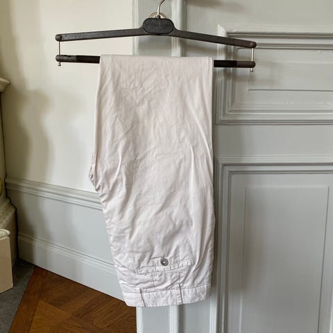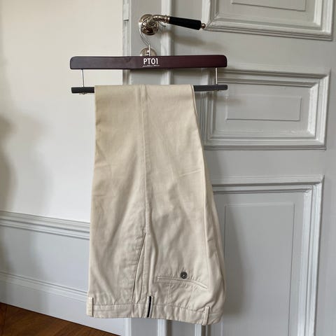 Klassisk modell med hällor för skärp, sidofickor fram och passpoalerade fickor bak.
