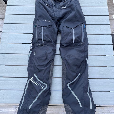 Byxorna har dragkedjor och justeringsmöjligheter vid benslut samt flera fickor med dragkedja. Urtagbart quiltat foder ingår för extra isolering vid kallare väder. Byxorna är avsedda för motorcykelåkning och har förstärkningar och skydd enligt märkning på insidan av linningen. Skrivet av blocket AI