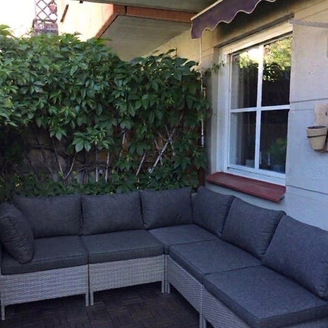 Hörngrupp för uteplats i vit konstrotting med mörkgrå sitt- och ryggdynor. Gruppen består av modulsoffa med två hörndelar samt en fristående fotpall/schäslongdel som kan placeras efter behov. Till gruppen hör även ett litet fyrkantigt sidobord i svart. Passar för användning på altan, balkong eller uteplats.