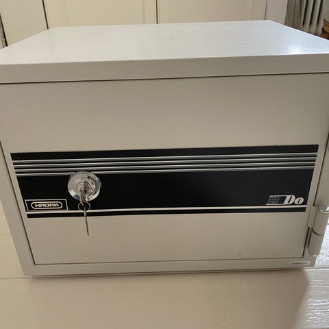 Håbeco kassaskåp i vitt metall. Skåpet har kraftig dörr med vred och låscylinder på fronten. Invändigt finns justerbara hyllskenor samt utdragbar låda längst ned för mindre föremål eller dokument. Lämpligt för förvaring av värdesaker, handlingar och annan utrustning som behöver förvaras inlåst. Skåpet är fristående och avsett för placering inomhus. Brandsäkert.