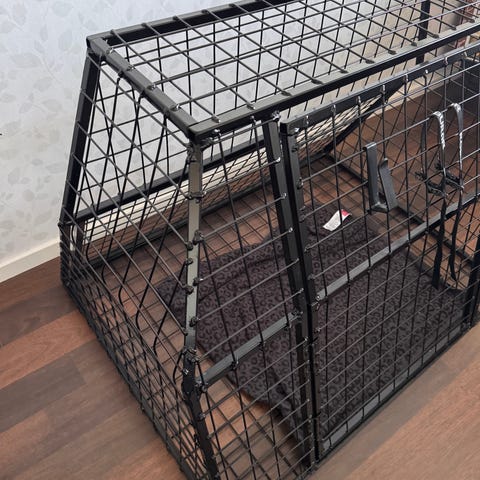 Låsbar hundbur med två separata dörrar framtill och evakueringluckor bak. Mellanvägg kan tas bort. Tillverkad av NKVERK,