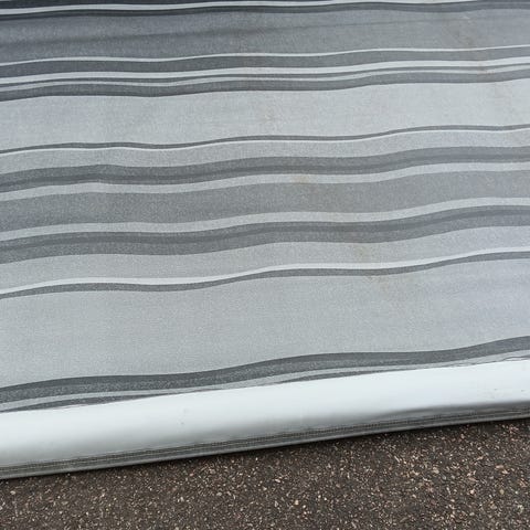 Markis för fönster med randigt gråvitt tyg. Levereras med kassett/rör, fästen, skruvar och monteringsanvisning enligt bilder. Lämplig för montering på vägg för att ge skugga över balkong eller fönster. Bredd ca 220 centimeter.