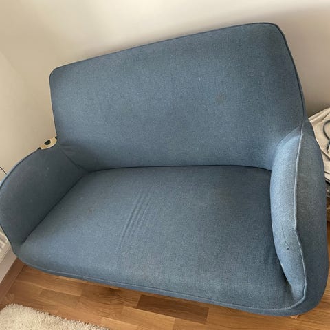 Soffa med hög rygg i rött tyg. Modellen har omslutande rygg- och sidostycken som ger avskärmning. Sittdelen är rak och stoppad för flera sittplatser. Passar i exempelvis kontor, väntrum eller lounge där man vill skapa en mer avgränsad sittplats. Finns några fläckar (se bild). Hämtas idag 17/4 alt mån 20/4- tis 21/4
