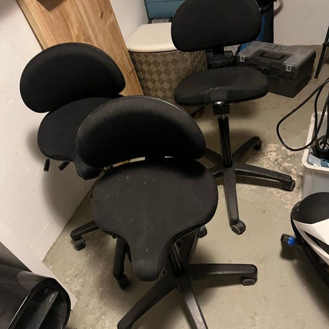 Ikea En svart sadelpall på hjul med justerbart stativ, lämplig som arbets- eller kontorspall. En svart stol med perforerad sits och ryggstöd på kryssfot, passande vid skrivbord eller matplats. En rund hopfällbar pall i trä med ribbad sits, praktisk som extra sittplats eller liten avställningsyta. Alla delar har neutral färgsättning som fungerar i många olika miljöer som kontor, arbetsrum eller hem.