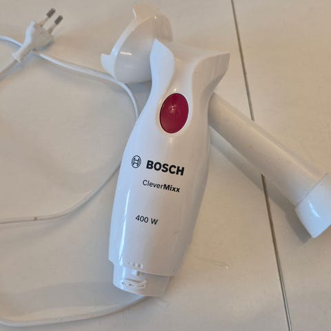 Bosch ErgoMixx stavmixer med en motoreffekt på 600W. Stavmixern är vit med grå detaljer och har avtagbar mixerfot i metall. På förpackningen visas tillbehör som blandningskärl och hacktillsats. Passar för mixning, hackning och tillredning av olika maträtter och drycker i hemmet.