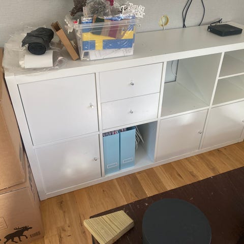 Säljer nu denna kallaxhylla från ikea då den inte får plats längre. 3 tyglådor, de två utdragbara lådorna samt luckan i trä ingår