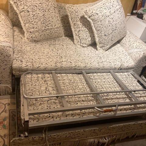 Bäddsoffa, blir dubbelsäng med utdragbar ribbotten. Mörkbrun stomme och vit rygg. Bäddmadrass ingår.