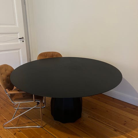 Runt handgjort bord. Bordet har en rund bordsskiva i svartbetsat trä och en cylinderformad pelarfot med vertikala ribbor i mörkbetsat trä. Passar som matbord eller köksbord i mindre till medelstora rum. Designen är enkel och funktionell med fokus på rena linjer och trästruktur.
