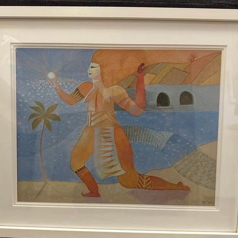 50 år gammal ca enl tidigare ägare inköpt på galleri. Sedan skickad till Sverige för inramning.