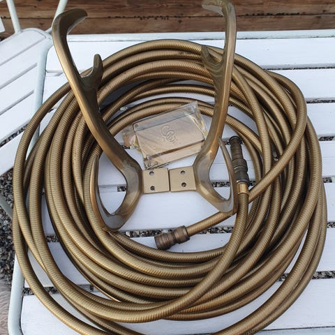 En slanghållare av galvaniserat stål, designad för att monteras på en vägg för att förvara trädgårdsslangar.