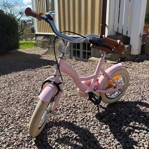 Stoy 12-tums hjul, barncykel med handbroms och stänkskärmar. Bytt däcken till mer slitstarka däck. Cykeln har några repor men är sparsamt använd och alltid förvarad inomhus.