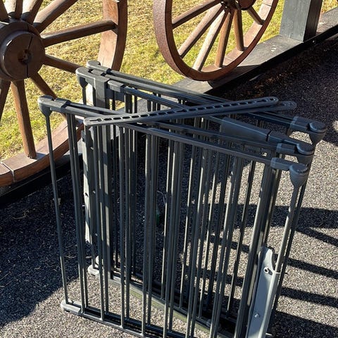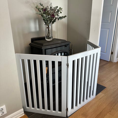 Består av flera sektioner med vertikala spjälor och en öppningsbar grindsektion för enkel åtkomst till kaminen.