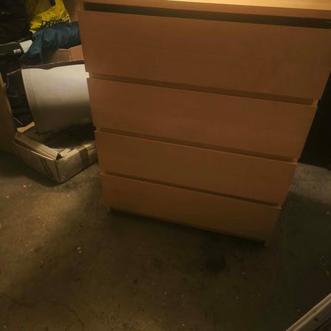 IKEA skoskåp i björkfaner med fyra separata fack. Skåpet är väggnära och tar liten golvyta, lämpligt för hall eller entré. Varje fack öppnas nedåt och rymmer flera par skor. Ytan är slät med synlig trästruktur och små runda knoppar på varje lucka. Passar för förvaring av skor och andra mindre accessoarer i hemmiljö.