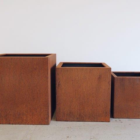 Två fyrkantiga utekrukor, 31x31 cm. Krukorna har dräneringshål i botten för avrinning av vatten.