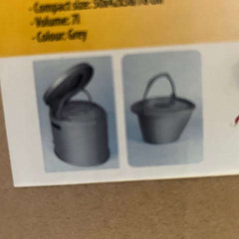 Portabel toalett i grå och vit plast. Består av två separata delar med övre sitsdel och nedre avfallstank som kan kopplas isär för tömning. Locket är uppfällbart och insidan har en integrerad skål. Toaletten är avsedd för användning i till exempel husvagn, båt, stuga eller andra platser utan fast toalettlösning.