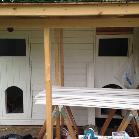 Stort isolerat hundhus. Går att montera ner i 6 delar. Tungt stått under tak ny pappa på taket behövs och någon planka.
