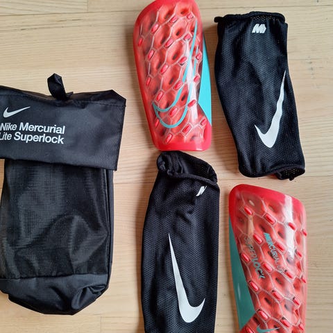 Nike benskydd i svart och rosa färg. Skydden har hård yttersida och vadderad insida med fäste för remmar. Avsedda för användning vid fotboll eller liknande sporter där benskydd krävs.