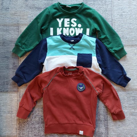 Flera olika tryck (3 av tryck bilderna på tröjorna är suddiga) och enfärgade varianter. Passar som vardagströjor eller under tröja/ytterplagg. Tröjorna har rund hals och är anpassade för småbarn i storlek 92.