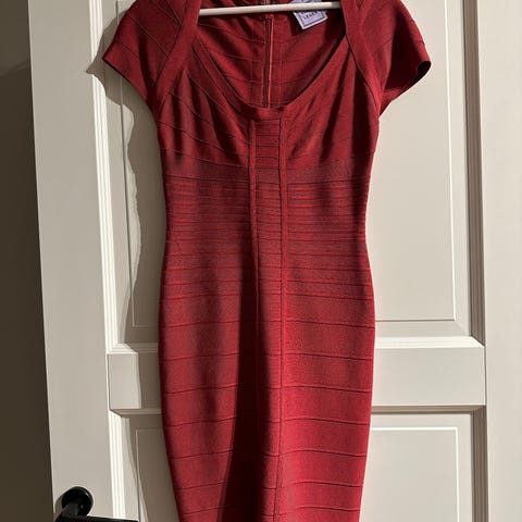 Hervé Léger party-/cocktailklänning för dam i storlek S. Ärmlös, knälång modell med figurnära passform. Klänningen har färgen Rose Red med bandageinspirerad struktur och markerad midja. Passar för fest- och kvällstillfällen.