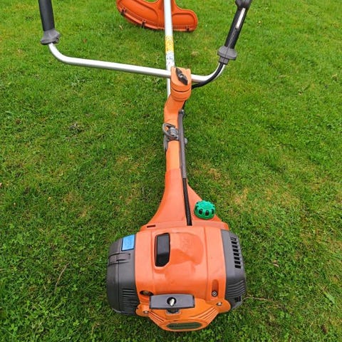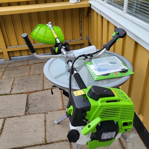 Röjsåg med sele och skydd. Bensindriven modell med motorenhet upptill och riggrör med handtag och skydd nedtill. Utrustad med bärsele för avlastning vid arbete. Lämplig för röjning av gräs, sly och liknande i trädgård eller på tomt. Färgkombination i rött, orange och metall.med följer sly klinga aldrig använt 0706794104