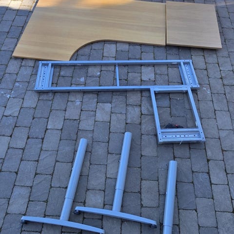 Av de två skåpen har ett hyllplan och ett lådor. Det finns även en låda under skivan. Det är inte ihopskruvat på bild, det har stått förvarat i modulerna. Ganska enkelt att packa in i en bil alltså. Nycklar till skåp och lådor finns ej. Skruvar ingår inte heller men det har använts vanliga träskruv för montering.