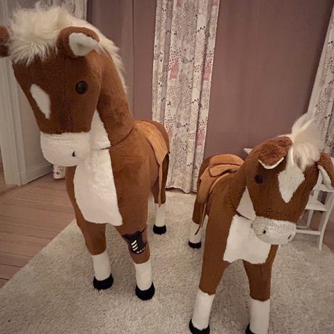 Mjukdjur i form av en häst i brun plysch med vita detaljer på mule och hovar. Stor modell. Över 1 meter lång. Perfekta presenten för hästälskande barn
