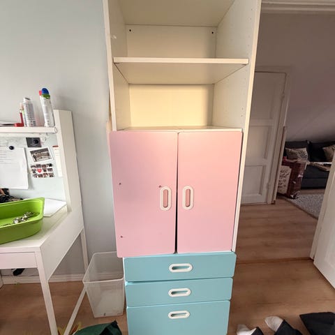 IKEA Stuva förvaringsmöbel för barn i vit färg. Möbeln har ett överskåp med dörrar, öppna hyllplan i mitten samt flera lådor längst ned. Passar för förvaring av leksaker, böcker, kläder eller andra barnrelaterade saker i barnrum eller lekhörna. Ytan är slät och lätt att torka av.