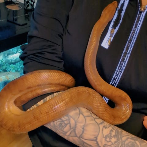 Orm reptil med mönstrad brun och beige teckning. Visas på bilder både hanterad och i terrarium med barksubstrat. Passar för köpare med intresse för reptiler och ormhållning. Ytterligare information om art, kön, ålder. Boa, hona ca 6 år runt 2,5 meter o ca 10 kg.