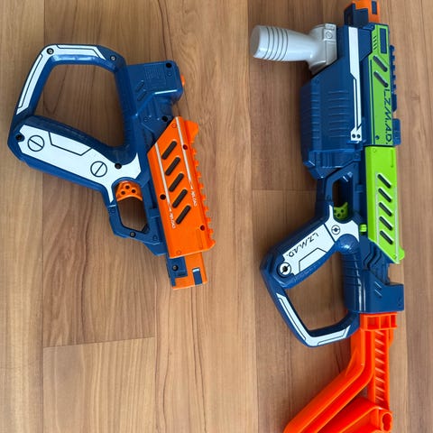 Leksaksvapen med skumbollar i blå och orange plast. Produkten består av en leksaksskjutare med två handtag och medföljande orangea skumbollar. Avsedd som barnleksak för lek med mjuka projektiler. Märkt med CE på handtaget. Lämplig för inomhus- och utomhuslek där bollarna skjuts iväg med hjälp av leksaksvapnet.