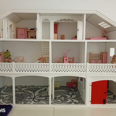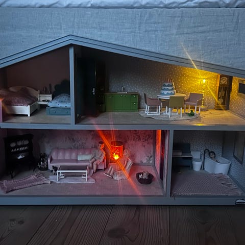 Lundby dockskåp i tre våningar, fullt möblerat. Möbler i varierat skick.