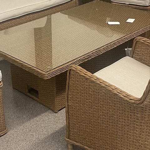 Elegant beige nätt Loungeset med soffa, 2 st fåtöljer som har justerbara ryggar. Bord samt glasskiva fås med gratis om man vill ha den.. har en skavank. Bredd soffa 115cm.