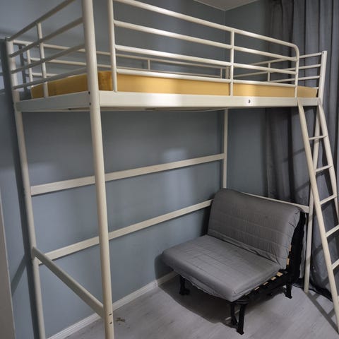 IKEA loftsäng i metall med grå finish. Sängen är upphöjd med stege och har skyddskanter runt liggytan. Under sängen finns utrymme som kan användas till exempelvis skrivbord, förvaring eller annan möblering. Passar i sovrum där man vill utnyttja höjden i rummet. Madrass och övrig inredning på bilderna kan ingå. Måtten är de som beskrivs av Ikea. Inte behjälplig med att flytta eller bära ut sängen. Priset diskuteras vid snabb affär.