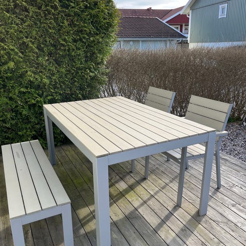 Möblerna består av ett bord om 100x102cm, en soffa med plats för tre personer samt 5 stolar (visst färgsläpp på några ställen på "ramen"). Du kan med andra ord sitta upp till 8 personer runt bordet. Säljes då det inte passar vårt nya boende.