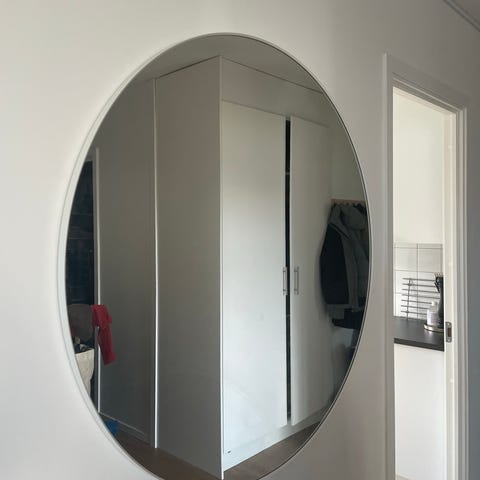 Mio rund spegel med flätad ram i naturfärgat material. Spegeln har en cirkelformad design med bred, dekorativ kant som ger en mjuk och naturlig känsla. Passar i exempelvis vardagsrum, hall eller sovrum som väggspegel eller stående dekoration.