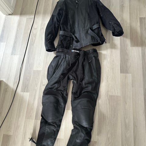 Motorcykelställ i svart skinn bestående av jacka, byxor, stövlar och handskar. Jackan är i läder med dragkedja framtill och flera fickor. Byxorna är i läder med förstärkta knäskydd. Stövlarna är höga motorcykelstövlar i läder med grov sula och spänne. Handskarna är vadderade motorcykelhandskar i läder. Utrustningen är avsedd för motorcykelåkning och ger skydd för överkropp, ben, fötter och händer. Priset gäller allt på bilden tillsammans.
