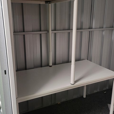Ståbord ställbar skrivbordshylla i vitlackerat trä. Består av en ryggplatta med flera urtag för att kunna justera höjden på två hyllplan. Det nedre planet fungerar som bordsskiva för dator eller tangentbord och det övre som avlastningsyta för exempelvis skärm eller tillbehör. Konstruktionen placeras på ett befintligt bord för att skapa en arbetsplats i ståhöjd. Passar för hemmakontor eller kontorsmiljö där man vill kunna variera arbetsställning.