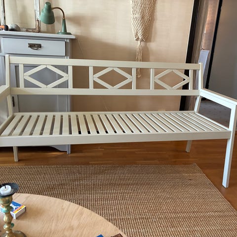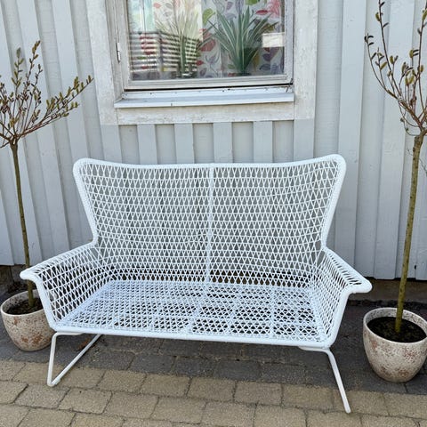 Säljer en utesoffa, Jotex Menton, i fint skick. Rejäl konstruktion i aluminium, vit pulverlack och med sittdyna (klädsel av polyester och foam av skumplastgummi).