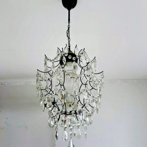 En vacker taklampa, med ”kristaller” av fina plast och glasdetaljer. Lampan är väl bevarad och är väldigt fin. Jag kan inte se att någon del saknas.