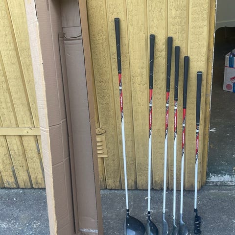 Junior set i bra skick, klubbor i bilden ingår. Original headcover till hybrid saknas men det fås med ett annat.